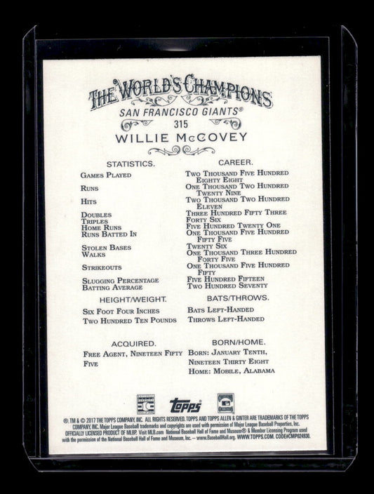 2017 Topps Allen and Ginter #315 Willie McCovey SP (San Francisco Giants)