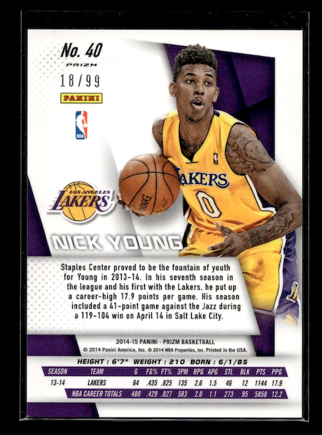 2014-15 Panini Prizm Prizms Blue #40 Nick Young #'d 18/99 (Los Angeles Lakers)