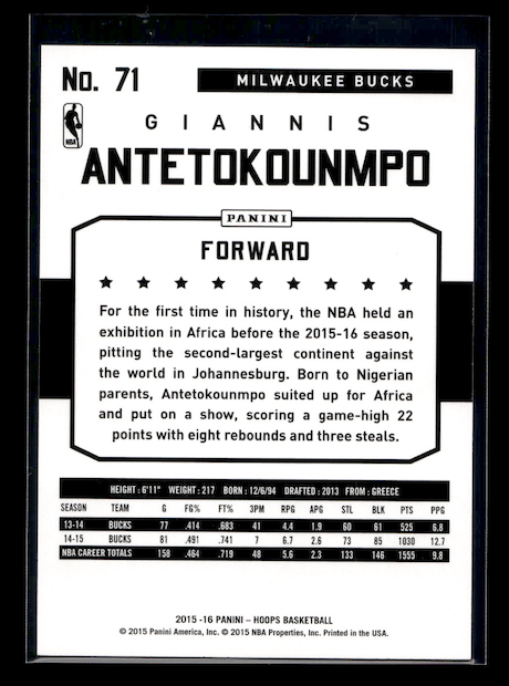 2015-16 Hoops Silver #71 Giannis Antetokounmpo #'d 191/299 (Milwaukee Bucks)