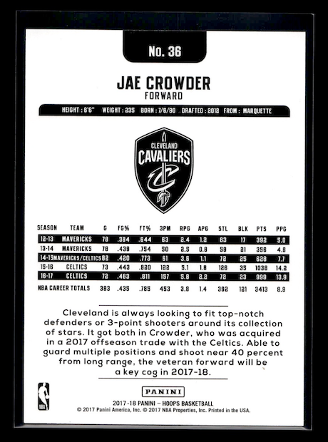 2017-18 Hoops Green #36 Jae Crowder (Cleveland Cavaliers/Boston Celtics)