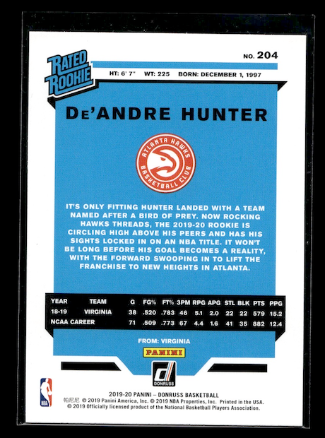 2019-20 Donruss #204 De'Andre Hunter Rate Rookie (Atlanta Hawks)