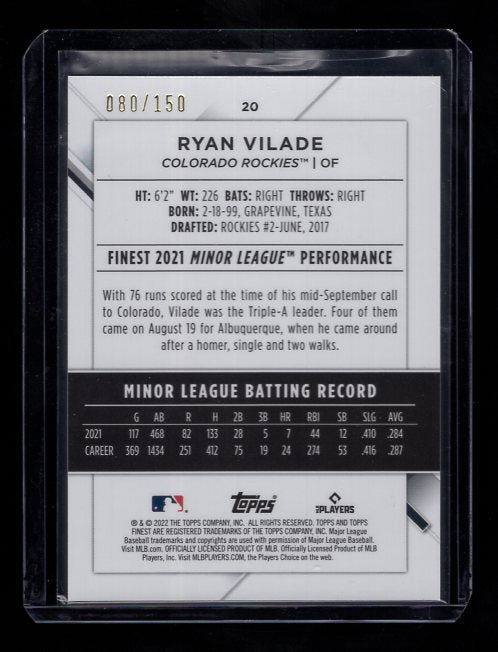 2022 Finest Blue Refractors #20 Ryan Vilade Rookie (Colorado Rockies)