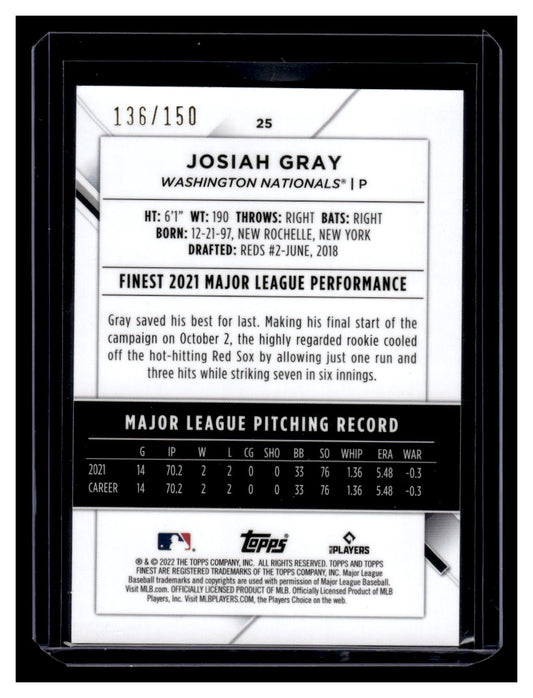 2022 Topps Finest Josiah Gray Rookie RC Blue Refractor #'d /150 SP (Washington Nationals)