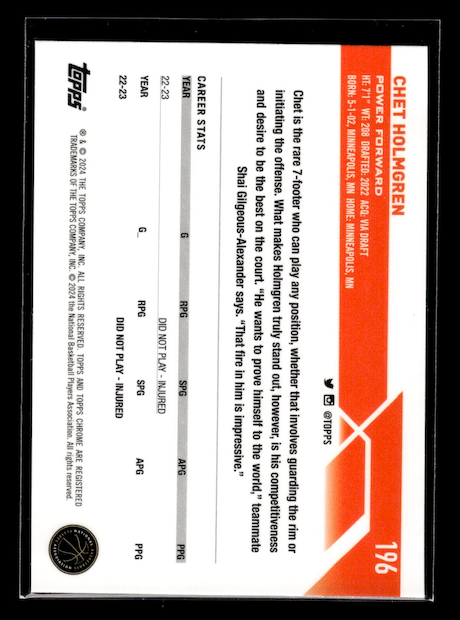 2023-24 Topps Chrome Green Topps Refractors #196 Chet Holmgren (Oklahoma City Thunder)