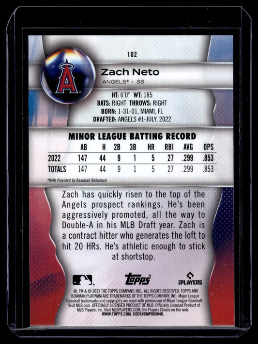 2023 Bowman Platinum #102 Zach Neto Rookie RC (Los Angeles Angels)