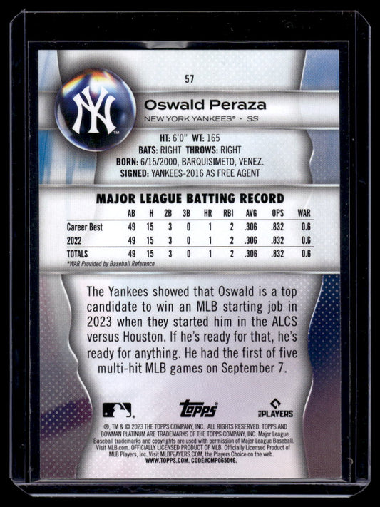 2023 Bowman Platinum #57 Oswald Peraza Rookie RC (New York Yankees)