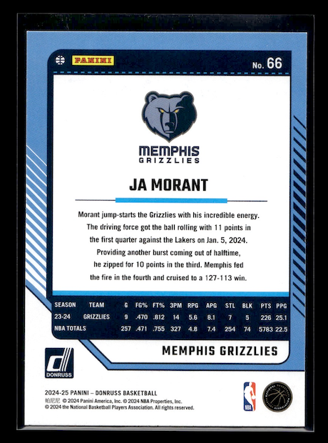 2024-25 Donruss Holo Green Laser #66 Ja Morant (Memphis Grizzlies)