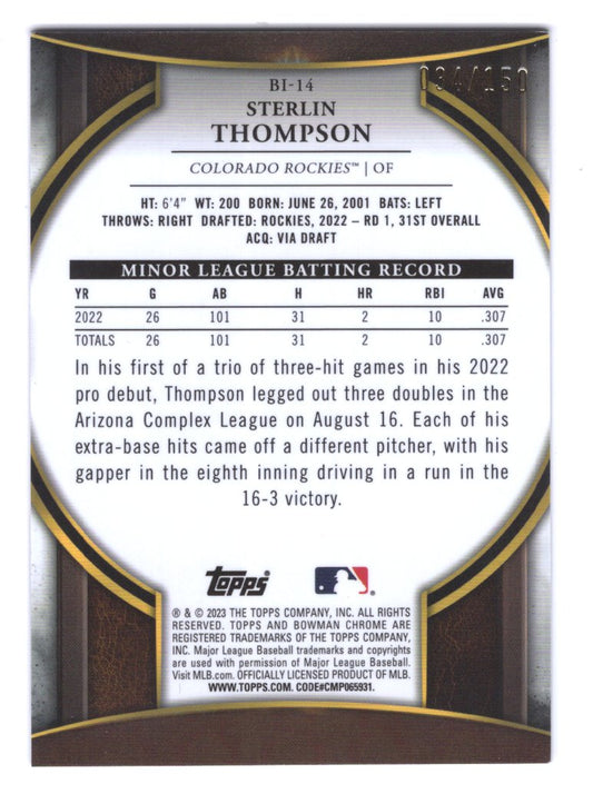 2023 Bowman Invicta Sterlin Thompson #BI-14 Cracked Ice #'d /150 (Rockies)