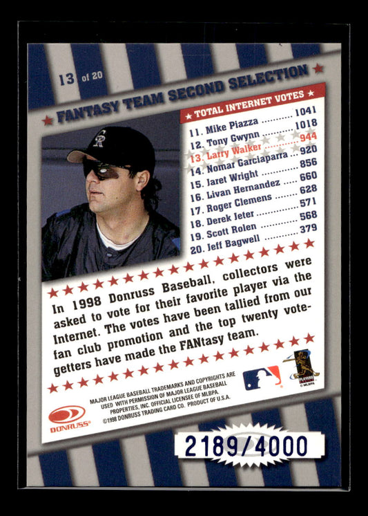 1998 Donruss FANtasy Team #13 Larry Walker #'d /4000 (Colorado Rockies)