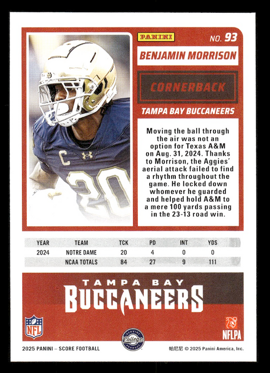 2025 Score Rookies #93 Benjamin Morrison (Tampa Bay Buccaneers)