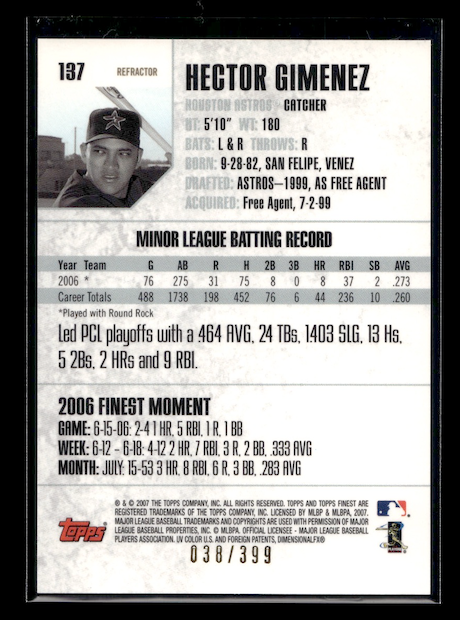 2007 Finest Refractors Blue #137 Hector Gimenez #'d 038/399 (Houston Astros)
