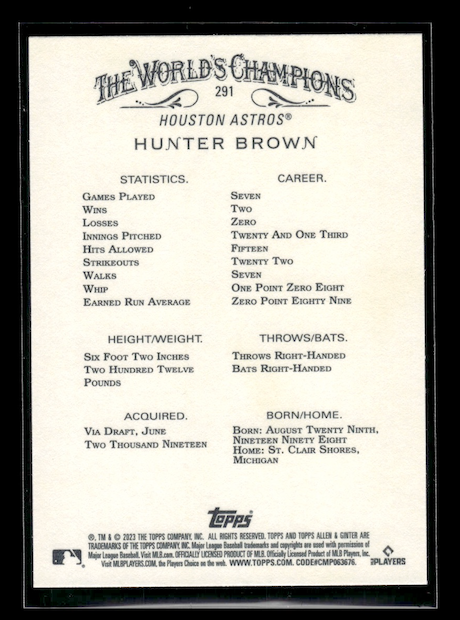 2023 Topps Allen and Ginter #291 Hunter Brown Rookie (Houston Astros)