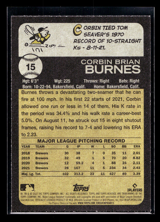 2022 Topps Heritage #15 Corbin Burnes (Milwaukee Brewers)