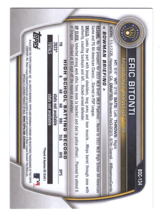 2023 Bowman Chrome Draft #BDC-134 Eric Bitonti 1st Bowman (Brewers)