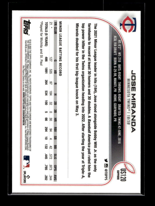 2022 Topps Chrome Update Sapphire #US120 Jose Miranda Rookie (Minnesota Twins)