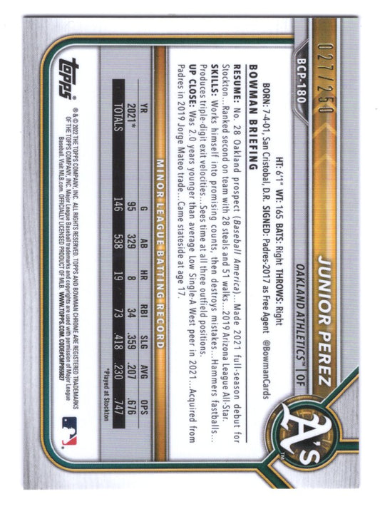 2022 Bowman Baseball Chrome Mojo 1st Junior Perez Purple Mojo Refractor /#'d 250 (Oakland A's)