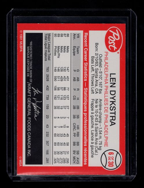 1991 Post Canadian #6 Len Dykstra (Philadelphia Phillies)