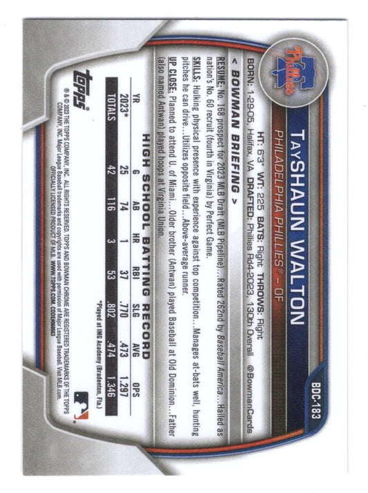 2023 Bowman Draft Chrome Tay Shaun Walton #BDC-183 YELLOW Refractor #'d /75 (Phillies)