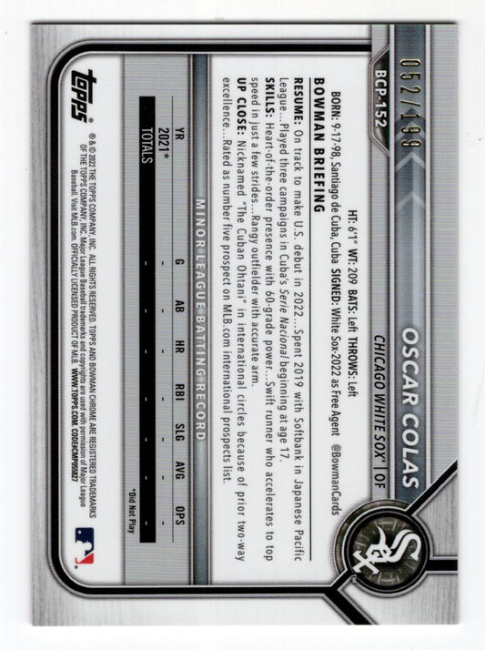 2022 Bowman Chrome Oscar Colas Fuchsia Refractor #'d /199 (White Sox)