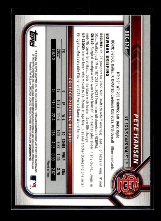 2022 Bowman Chrome Draft Sapphire #BDC176 Pete Hansen (St. Louis Cardinals)