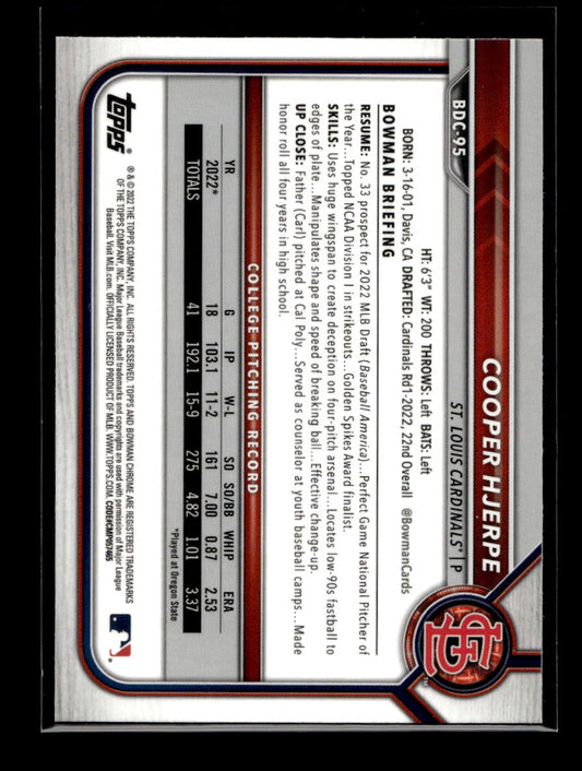 2022 Bowman Chrome Draft Sapphire #BDC95 Cooper Hjerpe (St. Louis Cardinals)