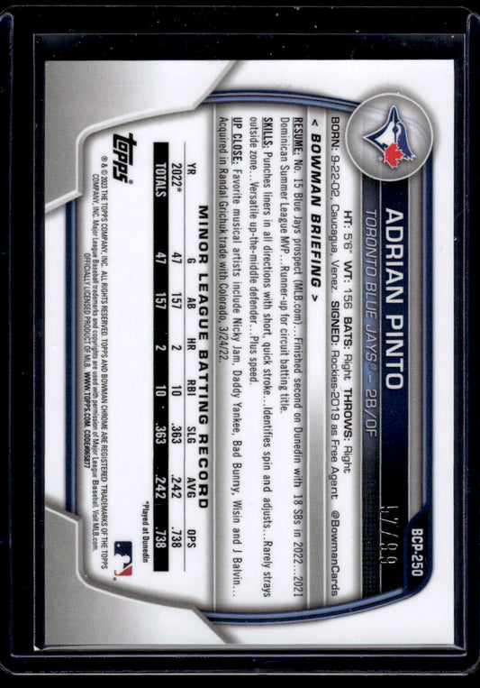 2023 Bowman Chrome "Chrome Prospects" #BCP-250 Adrian Pinto Green Refactor Rookie RC (Blue Jays)