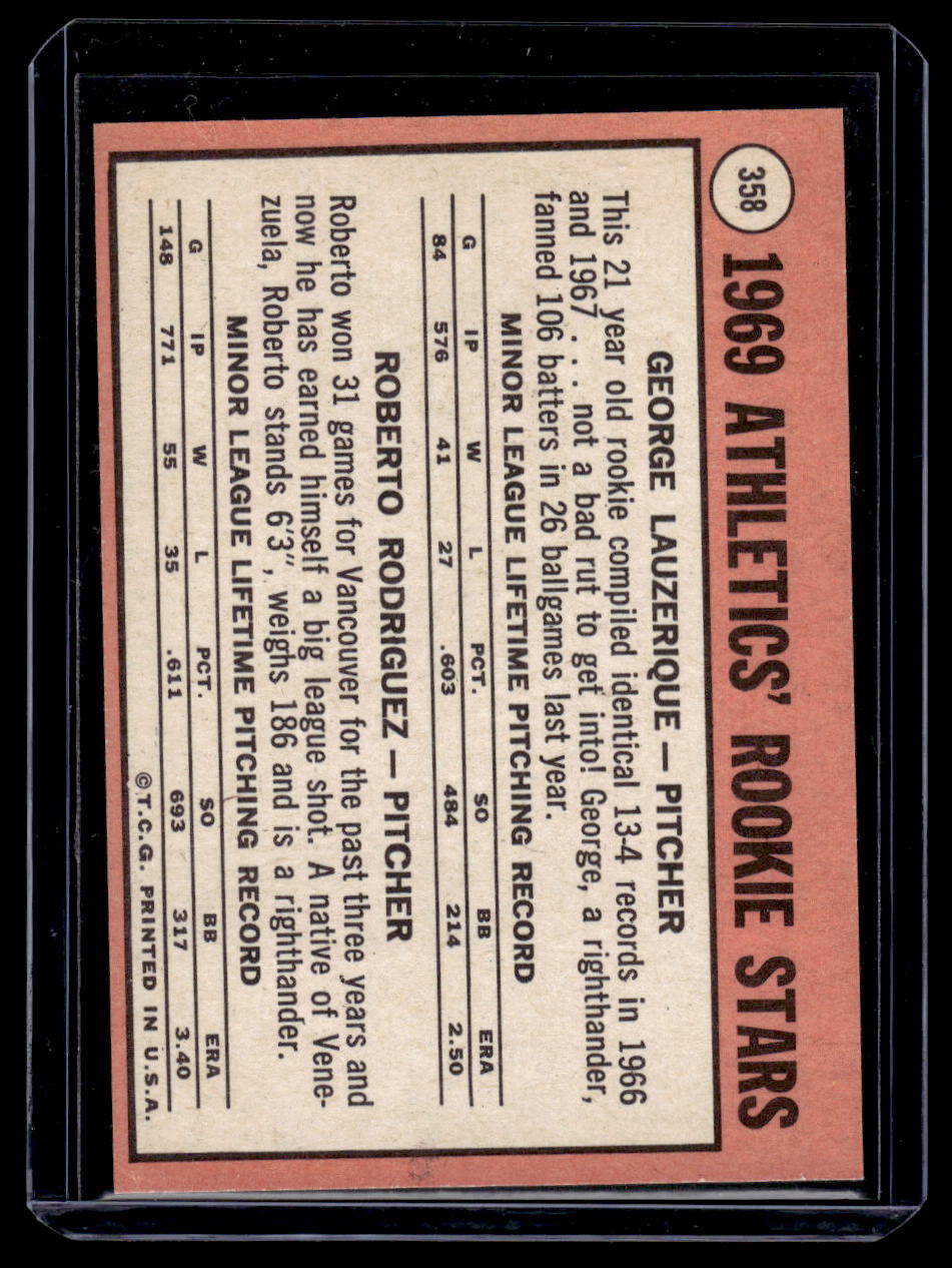 1969 Topps #358 Athletics "1969 Rookie Stars" (George Lauzerique / Roberto Rodriguez) RC