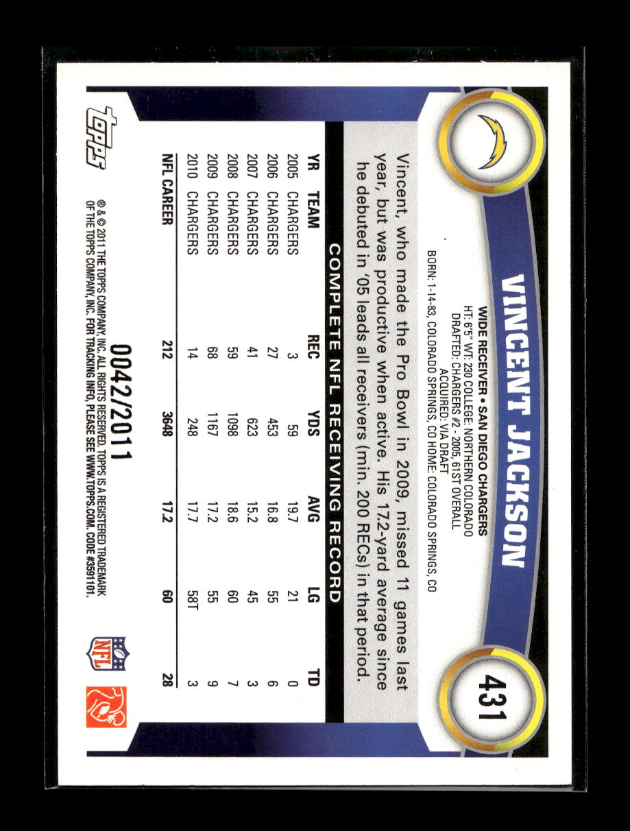 2011 Topps Gold #431 Vincent Jackson #'d /2011 (San Diego Chargers)