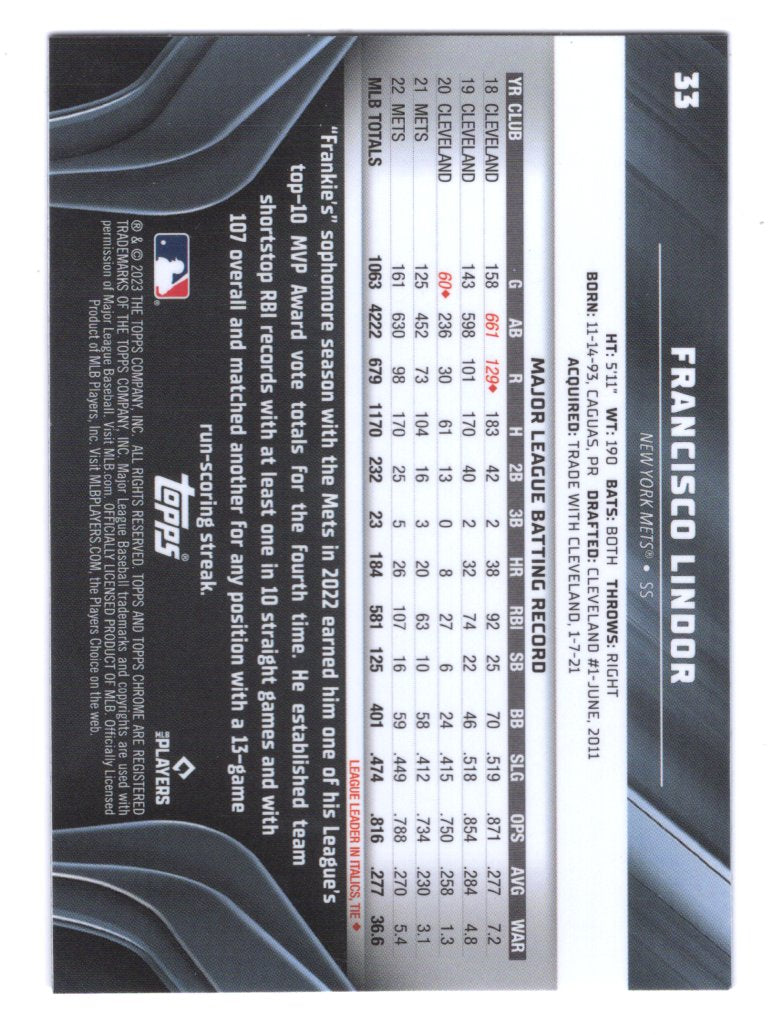 2023 Topps Chrome Black Francisco Lindor Card #33 (Mets)